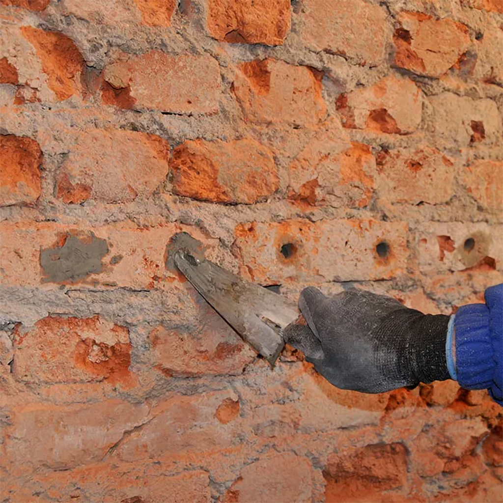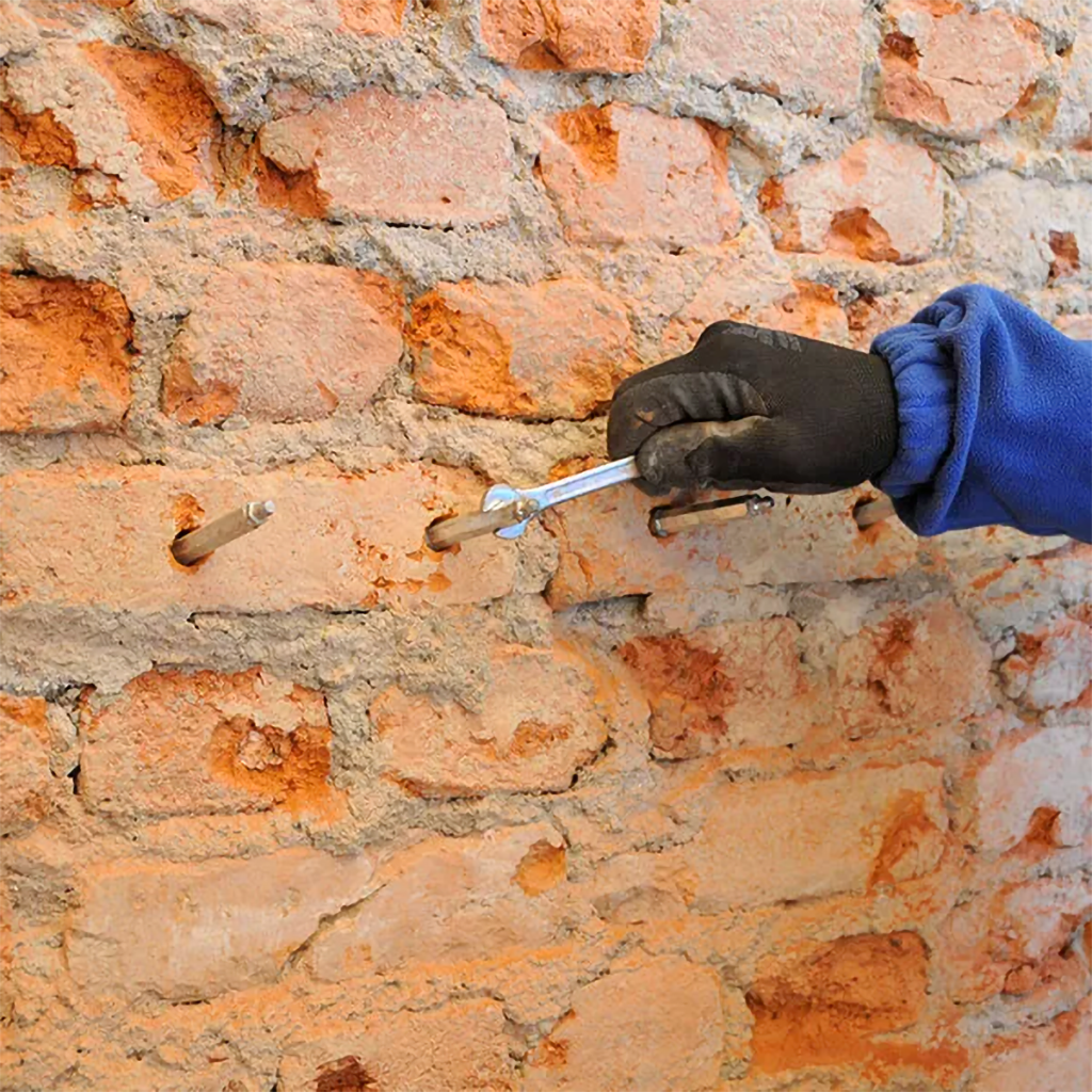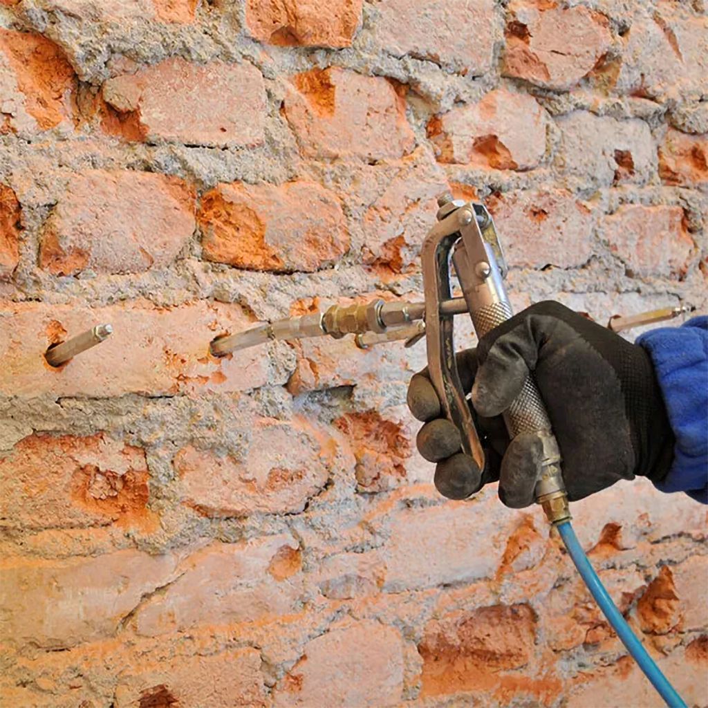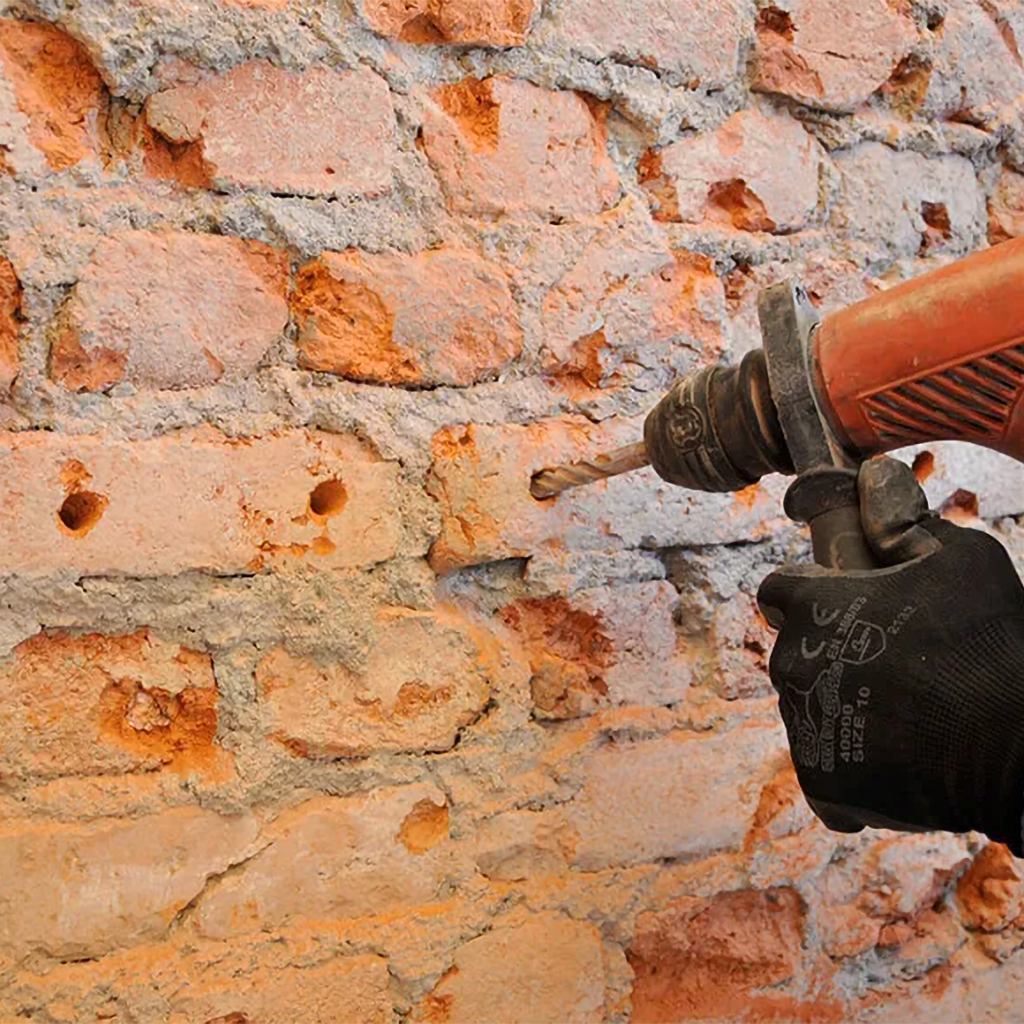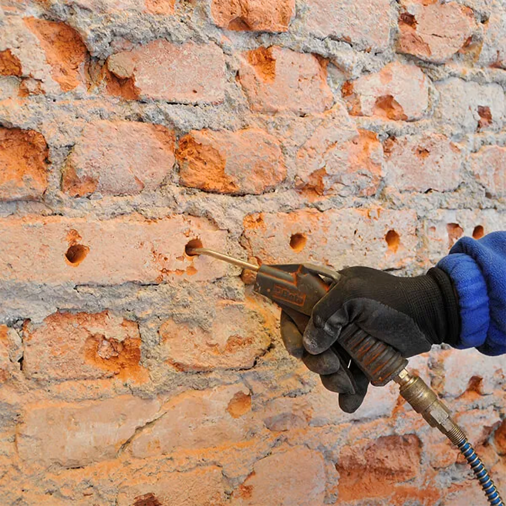 2. Tipo - Barriera Orizzontale a Pressione - Consiste nella fase di perforazione del muro - Pulizia con aria compressa - Inserimento Diffusori a caduta - Stuccatura dei Fori - Trattamento con Biocalce Biocomponente - Stuccatura Muro.